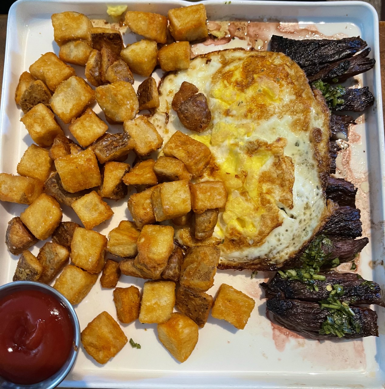 My boyfriend Andrew got the Chimichurri Steak & Eggs. Skirt steak, two eggs over easy, breakfast potatoes, and housemade chimichurri. He got his eggs over hard, and it was all so delicious.