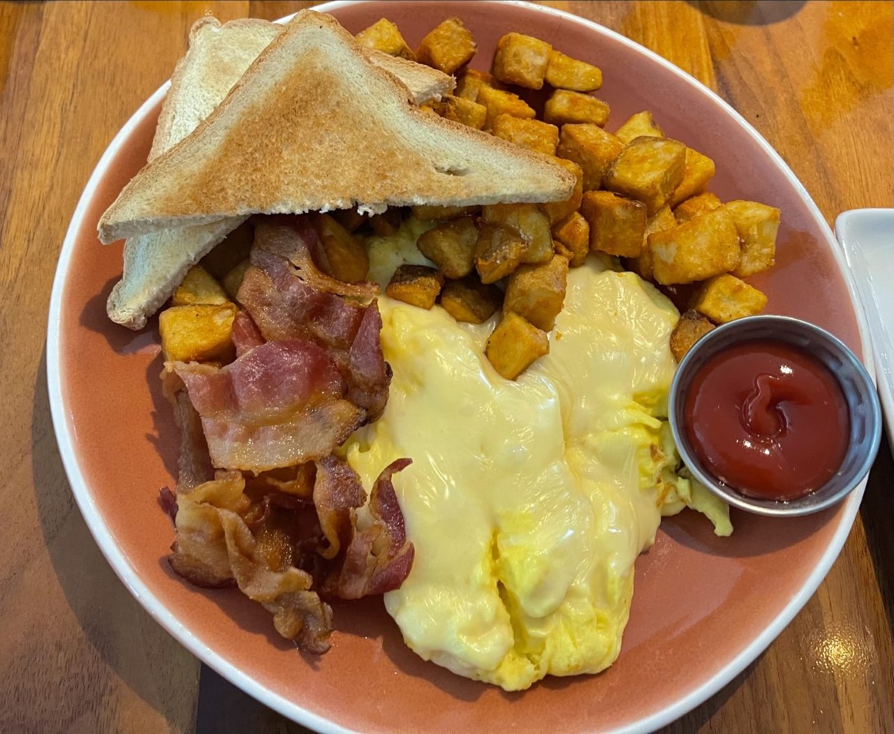 Two eggs any style with smoked bacon, pork sausage or chicken sausage, breakfast potatoes, and toast.